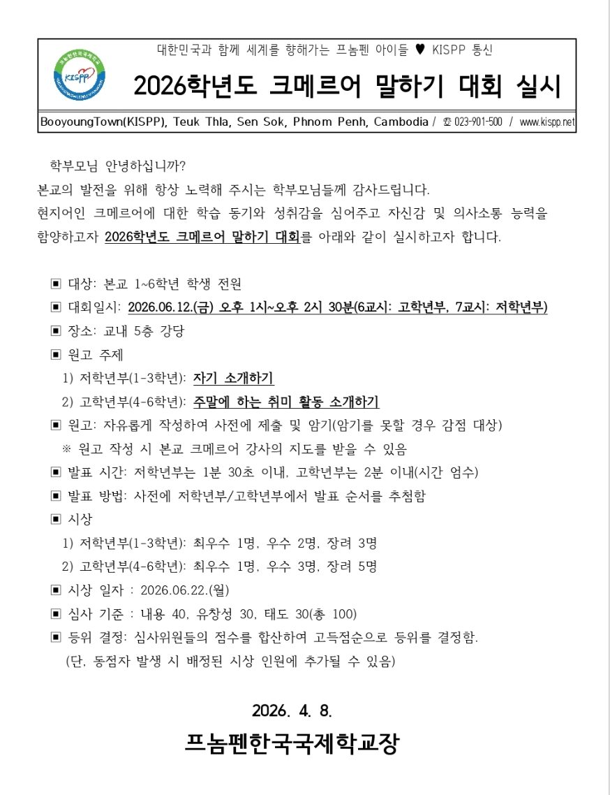 2026학년도 초등 크메르어 말하기 대회 안내